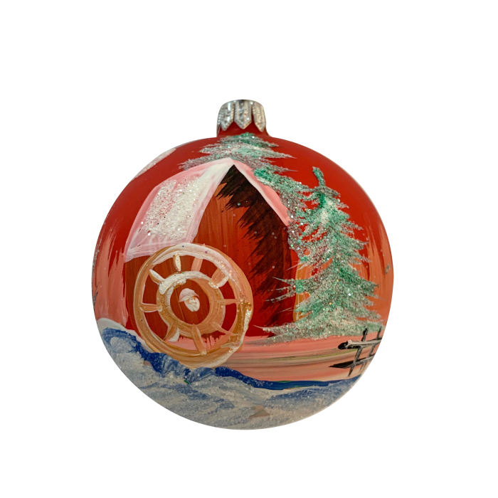 Glob din sticla suflata si pictata manual, Argcoms, Fabrica lui Mos Craciun, Moara pe apa, Multicolor, 80 mm, Sferic